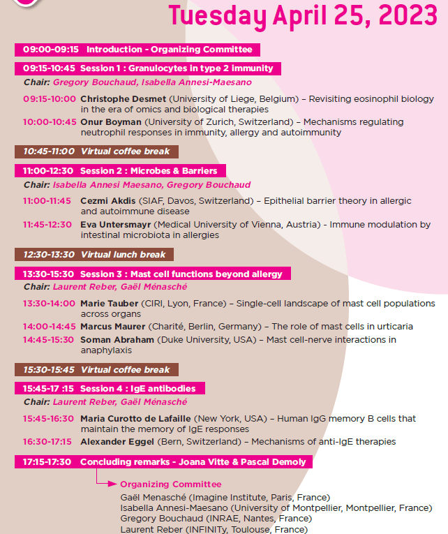 Allergy Research Today is organised by our colleagues Gael Menasche, Isabella Annesi-Maesano, Gregory Bouchaud, and Laurent Reber on behalf of the French Society of Allergology as part of its annual meeting. It aims at providing a selection of the most outstanding recent research in allergy and inflammation from young and senior scientists (program below and in the attached file).